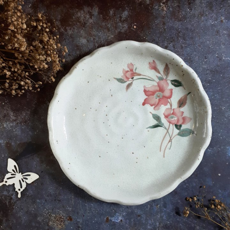 Đĩa TO men tiêu, vành uốn lượn trang trí hoa lá.